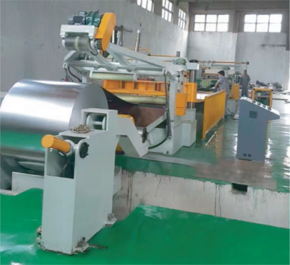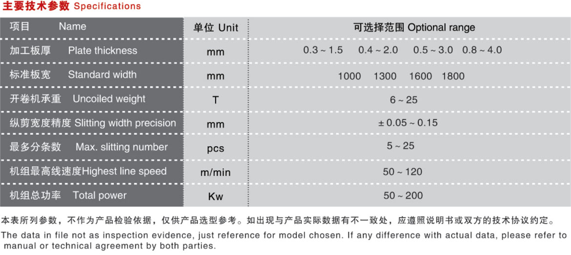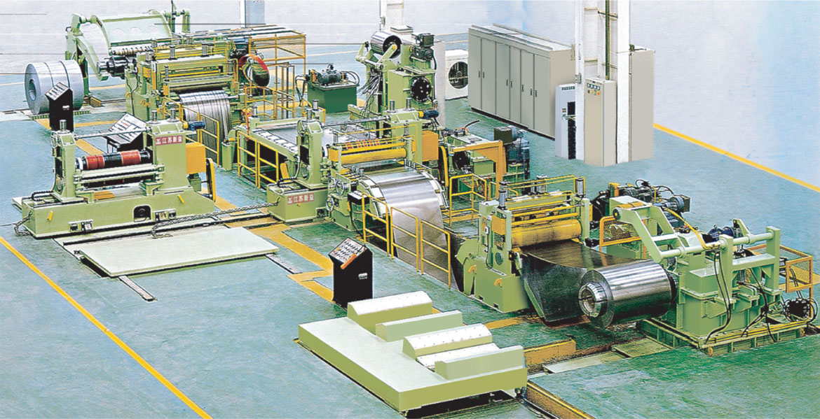 该生产线是冷轧金属板开卷纵剪收卷专用设备,正常配置上料小车、开卷、送料、圆盘刀片纵剪机、阻尼预分料、收卷机组、卸料小车、控制系统等单元机器外,在送料的后面可选粗校机构;还可根据客户需要配置一用一备两台纵剪机组。一台在线工作时,另一台进行更换刀片隔圈、隔套,维护修整,极大提高生产线的工作效率、增加产量降低成本。